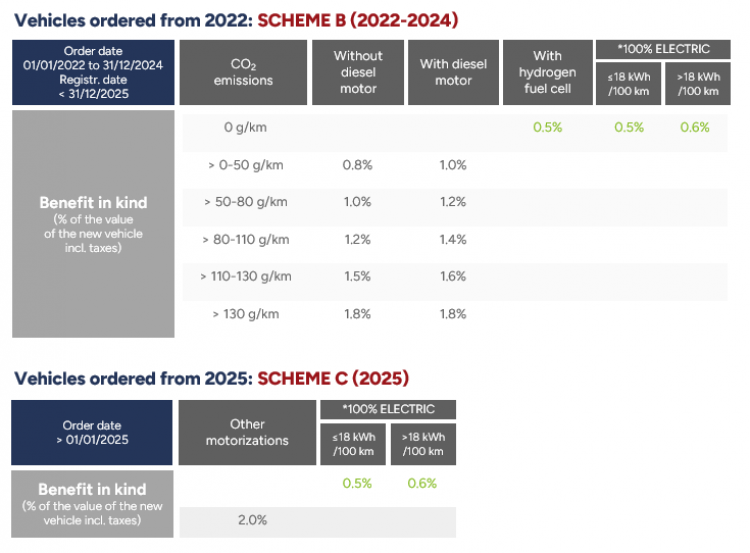 Currently, the benefit in kind is taxed at a flat rate of 0.5% (for consumption ≤ 18 kWh/100km) and 0.6% (for consumption > 18 kWh/100km) for electric vehicles, and at a flat rate of between 0.8% and 1.8% for internal combustion vehicles.